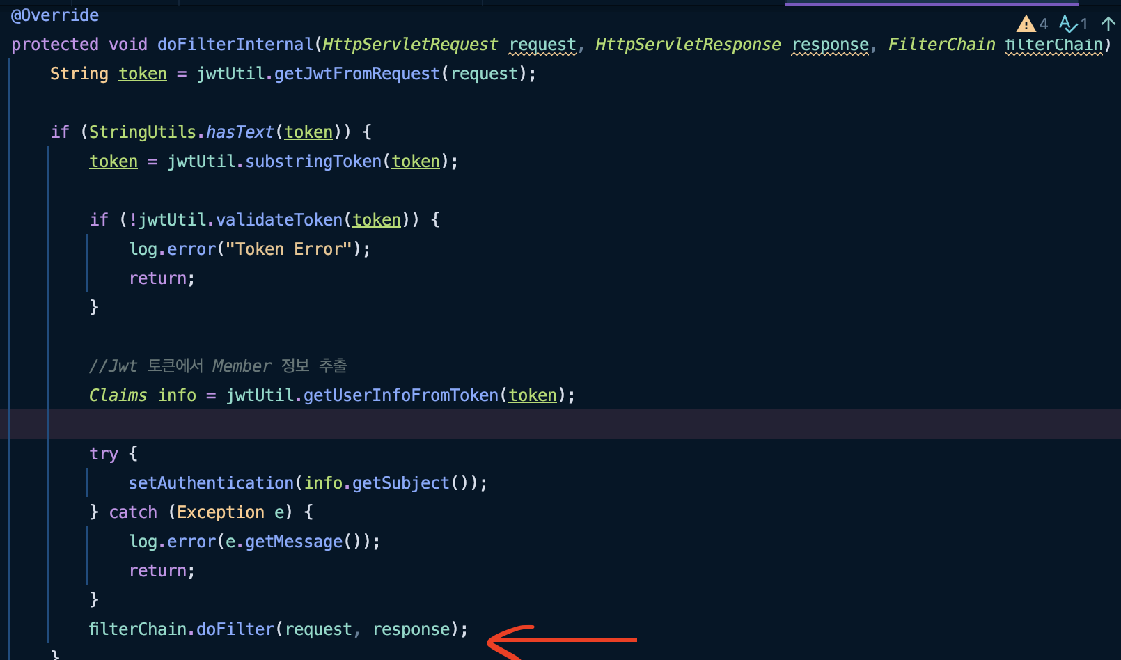 해당 코드는 토큰유무를 확인하고 토큰에서 멤버정보를 뽑아오고 다음 필터로 이동하는 코드이다.
