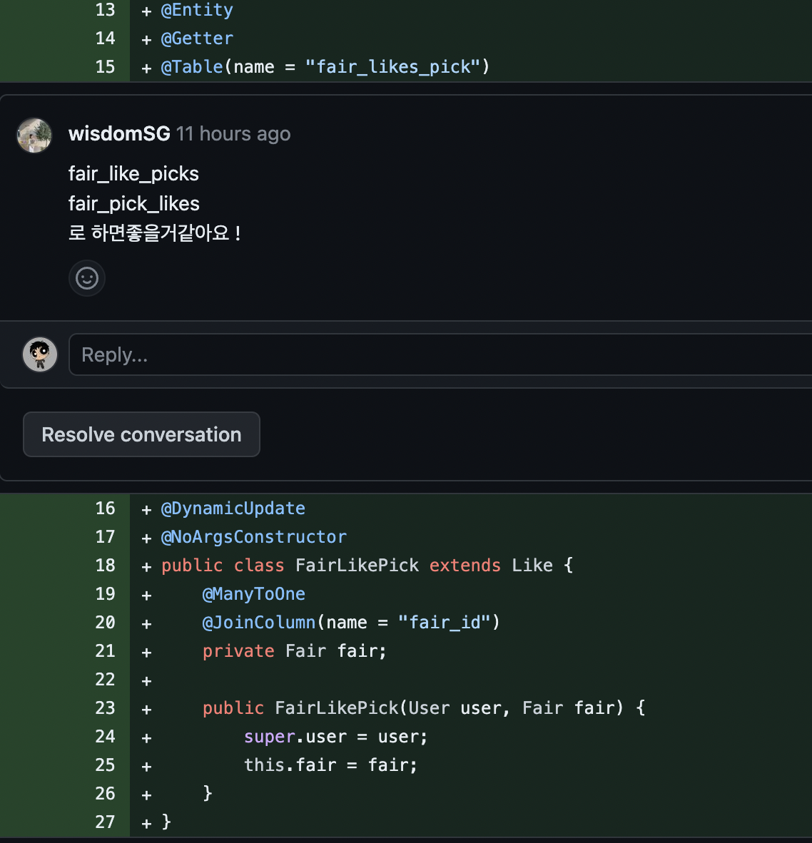 시간이 가장 많이 걸린건 모든곳에 다 쓰이는 주요 엔티티 이름 자체를 처음부터 잘못 지었다는 것이다... 이것 바꾼다고 시간을 많이 썼지만 이제 코드가 가독성도 좋아지고 깔끔해진 느낌이 들었다(이게 클린코드 인가...?)